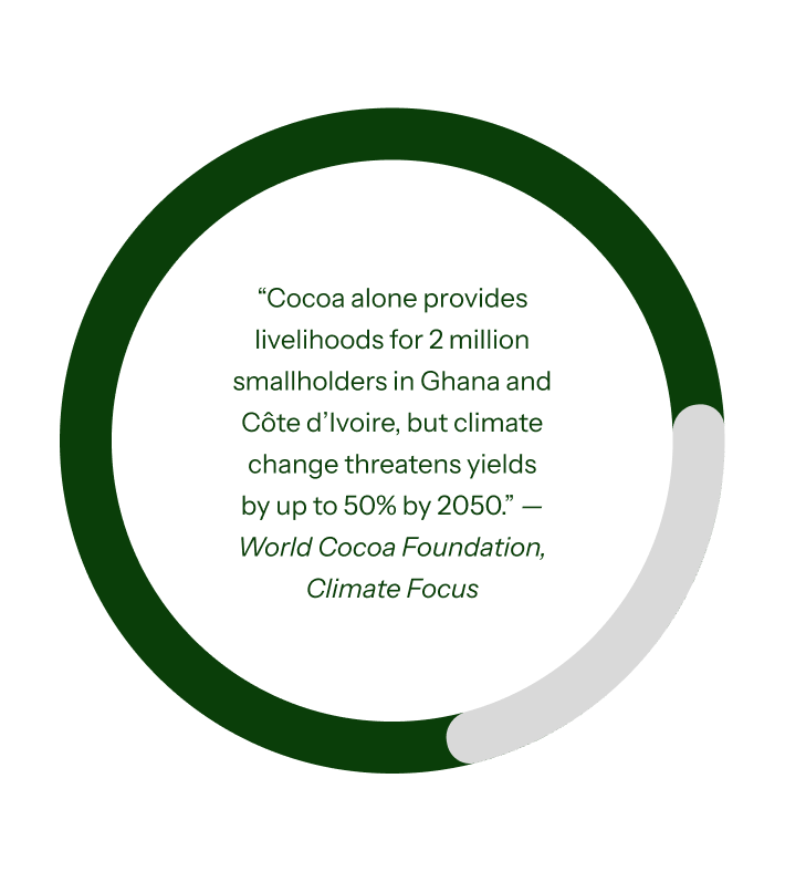 Cocoa alone provides livelihoods for 2 million smallholders in Ghana and Côte d’Ivoire, but climate change threatens yields by up to 50% by 2050. World Cocoa Foundation Climate Focus