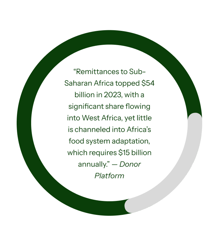 Remittances to Sub-Saharan Africa topped $54 billion in 2023, with a significant share flowing into West Africa, yet little is channeled into Africa’s food system adaptation, which requires $15 billion annually. Donor Platform