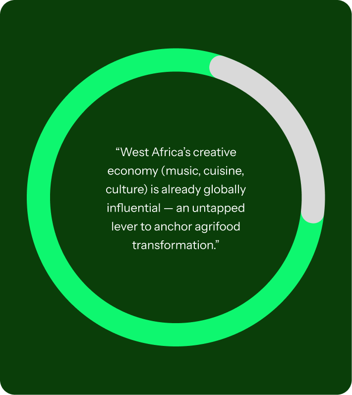 West Africa’s creative economy (music, cuisine, culture) is already globally influential – an untapped lever to anchor agrifood transformation.